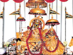 The Temple is simple with an open columned pavilion and a tiered courtyard enclosed by a low marble balustrade. Mounted on a sliver throne, the deity is shown with the typical dark blue countenance of Lord Krishna, playing a flute and ornamented with heavy crown and jewelry Radha – his consort sits beside him. It is concealed behind curtains. The daily viewing is an ecstatic occasion with crowds staring in silence at the sacred image, then raise their arms and in a great collective sigh, call out the prayer. As curtains fall the priests serve small Prasad to devotees, that they are blessed. The ceremony take place 5-7 times daily at appointed Hours. Krishna’s Birth anniversary Janmastami is the occasion which is celebrated every year at the temple, situated within the City Palace complex near Jaleb Chowk in Jaipur.